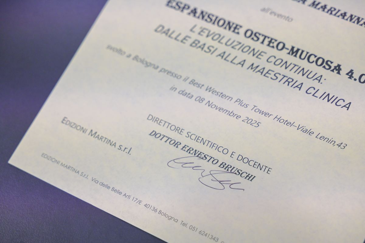 Ernesto Bruschi ha dichiarato: «Siamo qui a Bologna, grazie alla preziosa collaborazione delle Edizioni Martina, per presentare il corso “Espansione 4.0”, dedicato alle più innovative tecniche di espansione dei mascellari. Un passo avanti verso una nuova odontoiatria, capace di contribuire in modo sostanziale a mantenere l’Italia ai vertici della ricerca scientifica e clinica. L’obiettivo è ottenere una dentatura funzionale e armoniosa senza sacrificare i denti sani, come avviene per ragioni spesso di natura commerciale. Al contrario, riteniamo che gli impianti debbano essere inseriti solo dove realmente necessario, rigenerando in modo mirato le aree compromesse e preservando, quando possibile, i denti naturali. Oggi abbiamo ricevuto un riscontro estremamente positivo da parte dei partecipanti, professionisti provenienti da tutta Italia che hanno apprezzato e condiviso il nostro approccio. Con “Espansione 4.0” desideriamo diffondere sempre più questa filosofia clinica, per far conoscere i vantaggi che può offrire ai pazienti e ai medici».